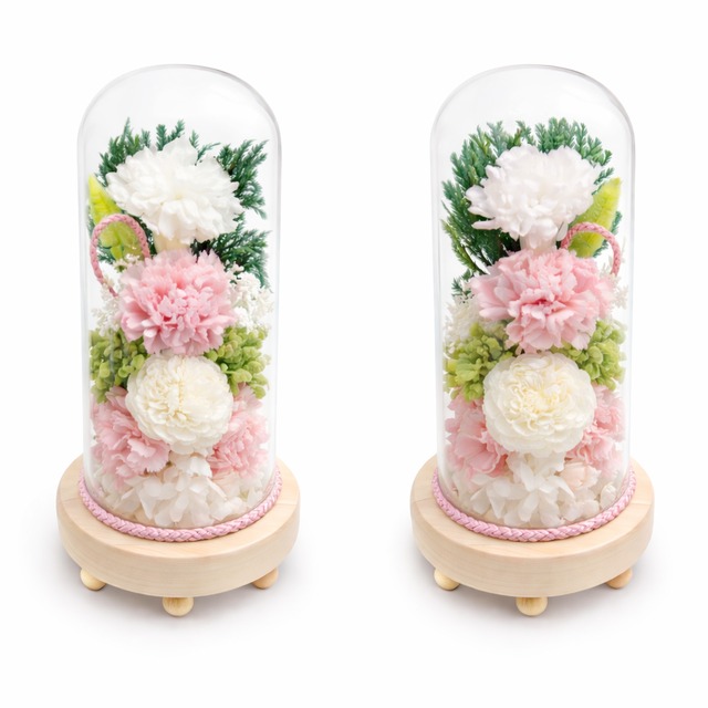 「お仏壇の左右に、祈りを込めて。対で飾る、格調高いプリザーブドフラワー。」 お仏壇の両脇にお花を対(つい)でお飾りすることは、古くから大切にされてきた供養のかたちです。「祈(いのり)」シリーズは、その美しいしきたりをプリザーブドフラワーで叶えました。 高さ23cmのガラスドームに、木製台座のぬくもりと上品な組紐をあしらったデザイン。左右に並べたとき、自然に生まれる対称の美しさが、お仏壇まわりに清らかで整った雰囲気をもたらします。組紐も左右対で入っており、細部まで心を込めたつくりです。 ホワイトは凛とした清廉な印象、ピンクはやさしく穏やかな雰囲気、パープルは落ち着いた格調の高さ。故人様のお人柄やお仏壇の雰囲気に合わせて、3色からお選びください。 「まずは片方だけ」というお求め方も可能です。後日もう片方を追加して対にすることもできますので、ご予算やお仏壇のスペースに合わせてお選びいただけます。 対で飾れるガラスドーム祈(いのり) プリザ製 サイズ(約)直径11.5×高さ23cm 重さ(約)348g 【素材】 プリザーブドフラワー・アレンジ用 スポンジ・ガラス・組紐 木製台座 個装箱(白色)入り 【プリザーブドフラワーとは】 本物のお花の美しさを、ずっとそばに。 プリザーブドフラワーは、生花に特殊な加工を施し、みずみずしい美しさを長期間保てるようにしたお花です。ドライフラワーや造花とはまったく異なり、花びらの繊細な質感や鮮やかな色合いはそのまま。生花と見間違えるほどの自然な風合いが特徴です。 水やりや水替えは一切不要。花粉も出ないため、お仏壇まわりを汚す心配がありません。適切な環境でお飾りいただければ、数年にわたって美しい状態をお楽しみいただけます。 毎日のお花の交換やお手入れのご負担を気にされている方、お仏壇にいつもきれいなお花を欠かしたくないとお考えの方に、プリザーブドフラワーの供花はぴったりのお花です。 普段はプリザーブドフラワーをお飾りいただき、ご命日やご法要など特別な日には生花をお供えするなど、暮らしに合わせた使い分けも多くの方に選ばれています。 プリザーブドフラワーの特長: - 生花を加工した本物のお花。造花にはない自然な質感と美しさ - 水やり・水替え不要。日々のお手入れの負担がありません - 花粉が出ないため、アレルギーが気になる方にも安心 - 数年間、美しい状態が続きます - お仏壇を水滴や花粉で傷める心配がありません ※高温多湿・直射日光を避けてお飾りください。