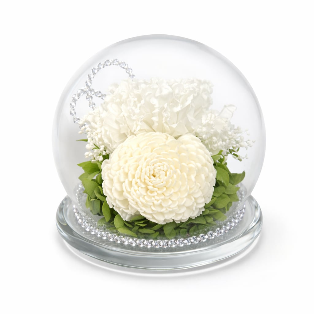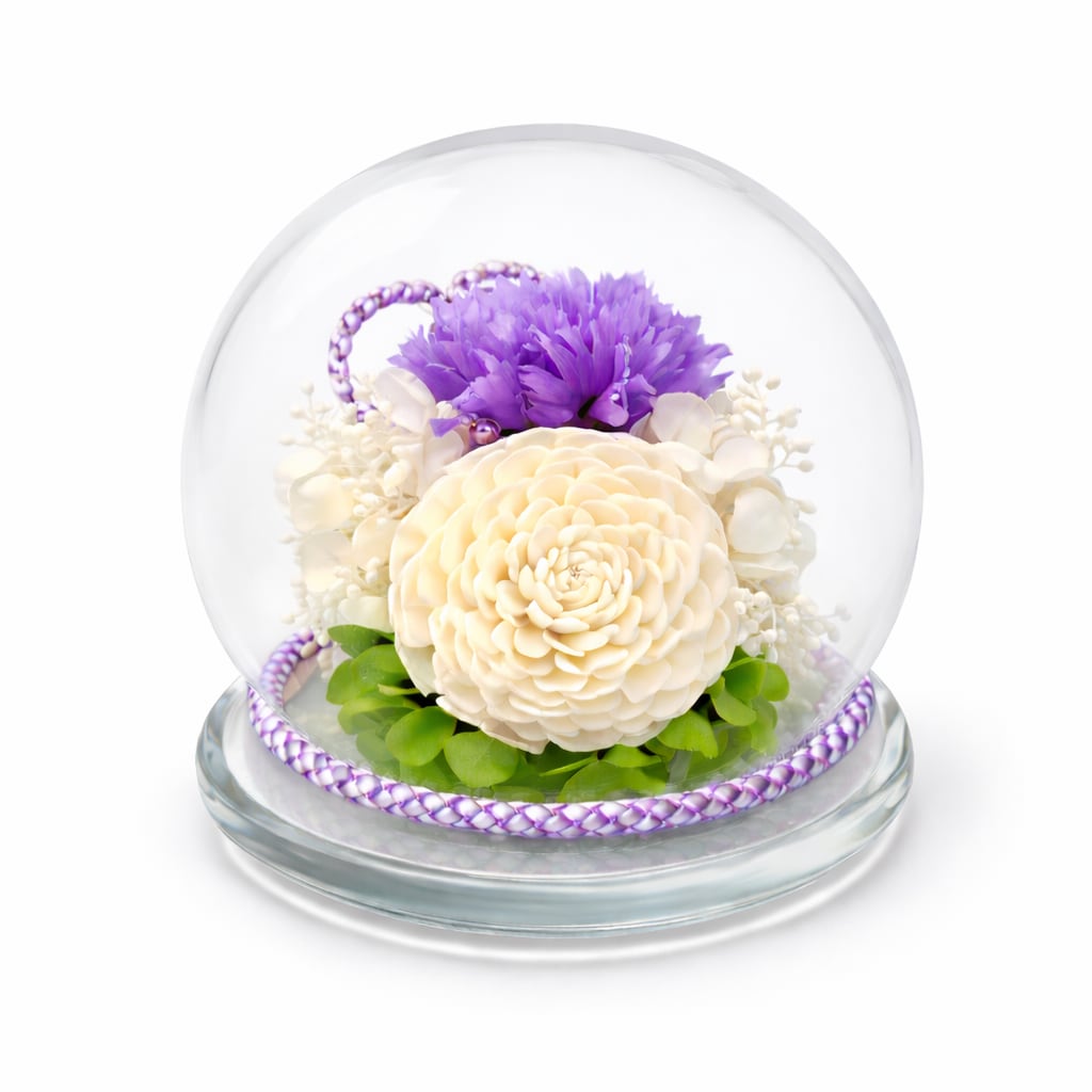 透明なガラスドームの中に、プリザーブドフラワーをひとつひとつ丁寧にアレンジいたしました。後飾り祭壇でお使いいただいたあと、そのままお仏壇へ。故人様のおそばで、長く美しく咲き続けます。