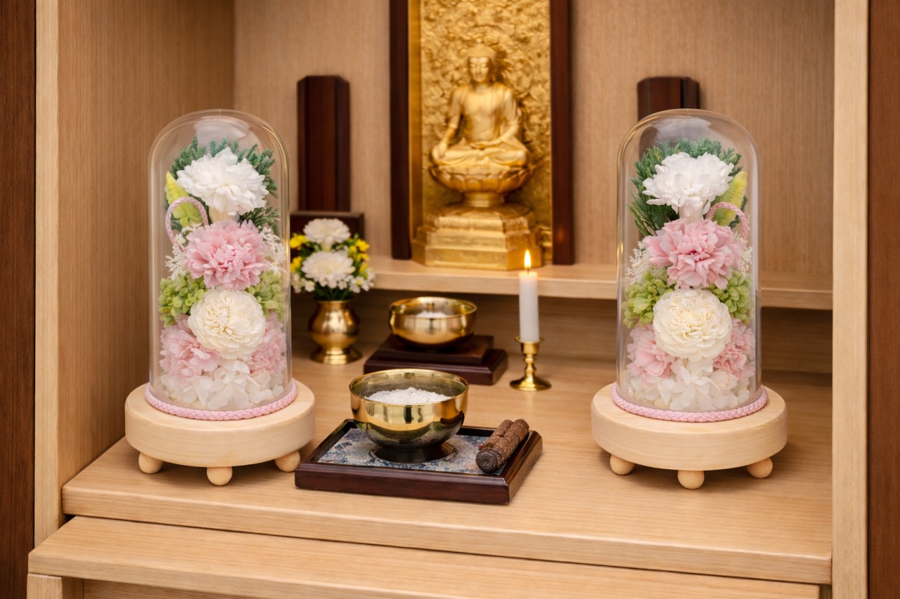 「お仏壇の左右に、祈りを込めて。対で飾る、格調高いプリザーブドフラワー。」