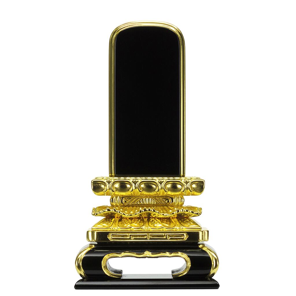三方金猫丸は、台座の三方に金箔を施し、角を丸く仕上げた優美なフォルムの塗位牌です。漆黒の本体と金箔のコントラストが華やかな印象を与えます。