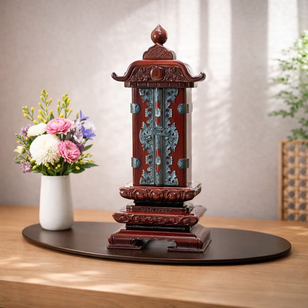 雲二重回出は、笠部分の雲形装飾と二重構造の台座が特徴。黒檀・紫檀の重厚感と伝統的な意匠が、格調高い佇まいを演出します。